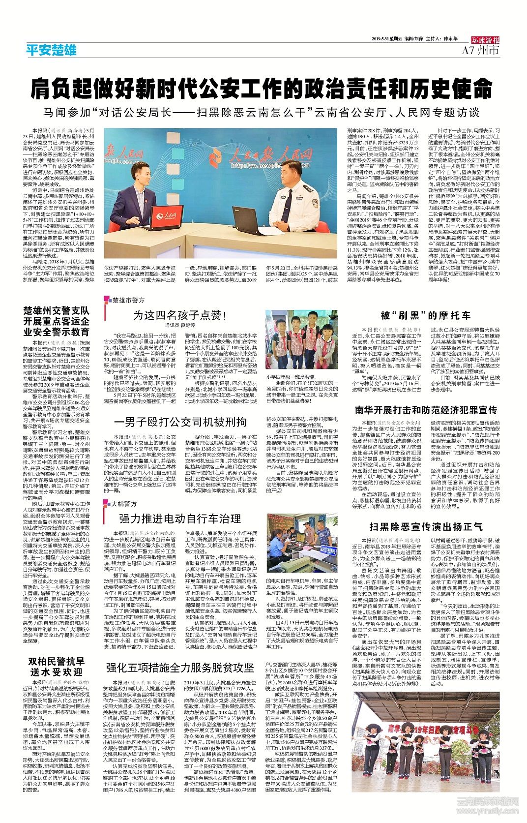 訪談中,馬聞結(jié)合楚雄州地處云南中部、多民族聚居等特點(diǎn),系統(tǒng)闡述了楚雄州公安機(jī)關(guān)在州委、州政府和省公安廳黨委的堅強(qiáng)領(lǐng)導(dǎo)下,創(chuàng)新建立掃黑除惡“1+10+10+5+N”工作機(jī)制,扭轉(zhuǎn)了過去刑偵部門單打獨(dú)斗的被動局面,形成了“所有工作以掃黑除惡為統(tǒng)領(lǐng)、所有力量向掃黑除惡聚集、所有資源為掃黑除惡服務(wù)、所有成效以人民滿意為標(biāo)準(zhǔn)”的良好工作格局,并就階段性戰(zhàn)果進(jìn)行概述。