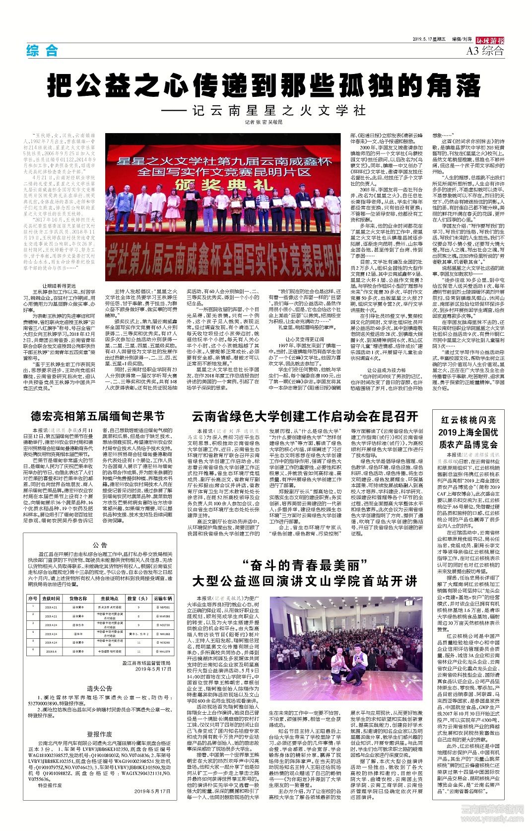 據(jù)了解,本次大型公益演講活動一經(jīng)推出,就收到了各大高校的熱捧和邀約,目前中醫(yī)院大學、曲靖農(nóng)校、云南國土資源學院、云南工商學院、云南經(jīng)濟管理學院已經(jīng)確定依次開展巡回演講。(文章來源環(huán)球游報2019年5月17日第1187期A3版)