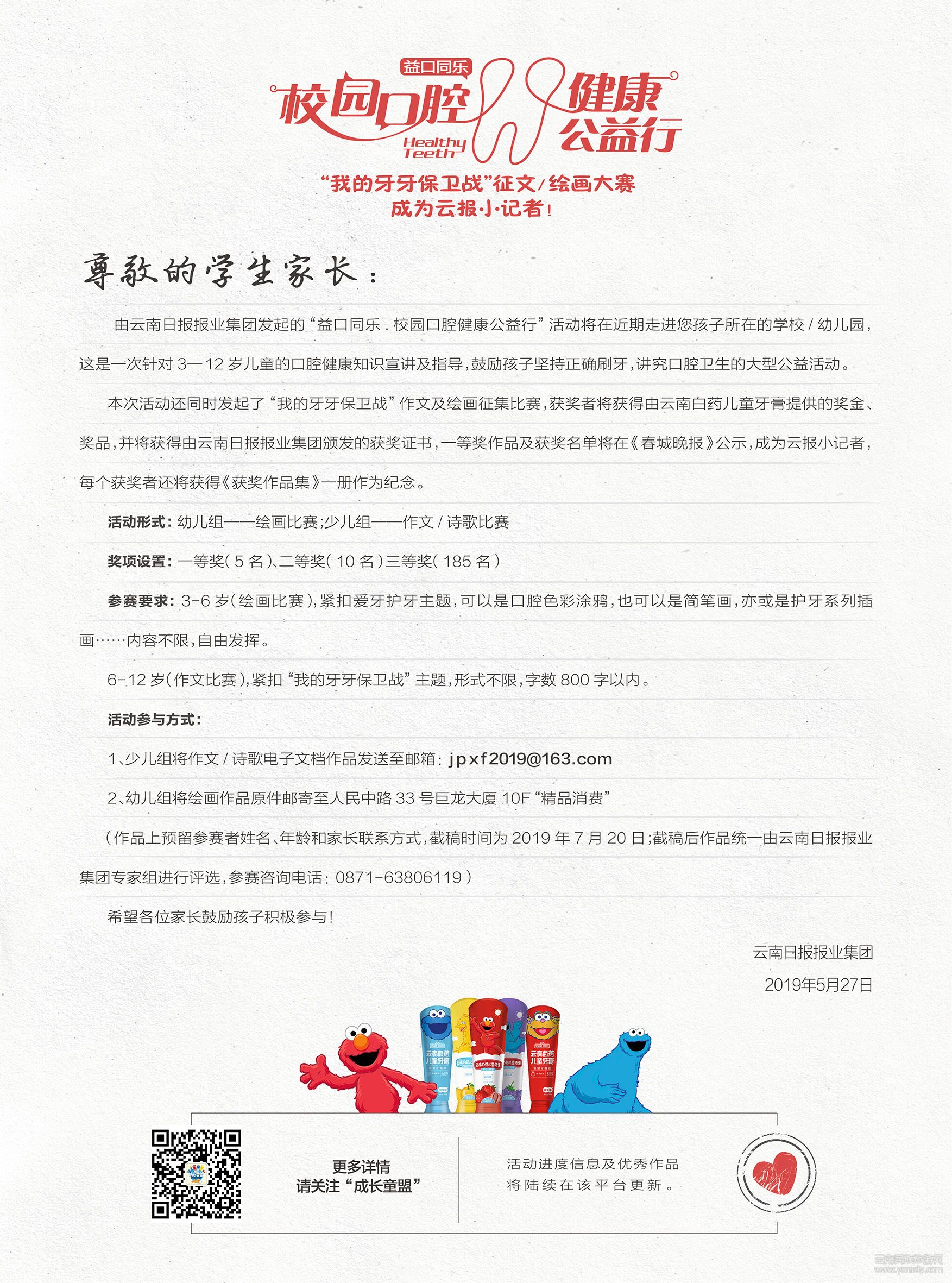 所以,除了講座、繪畫體驗(yàn),云南日報(bào)報(bào)業(yè)集團(tuán)還向全省3-12歲的孩子發(fā)出了愛牙護(hù)牙主題的繪畫/征文比賽邀請,3-6歲的孩子,畫下你的愛牙護(hù)牙畫面;7-12歲的孩子,寫出你的護(hù)牙故事或感想,成為云報(bào)小記者,贏取獲獎(jiǎng)證書和獎(jiǎng)品,8月下旬,將在云南日報(bào)大樓對獲獎(jiǎng)?wù)哌M(jìn)行頒獎(jiǎng)