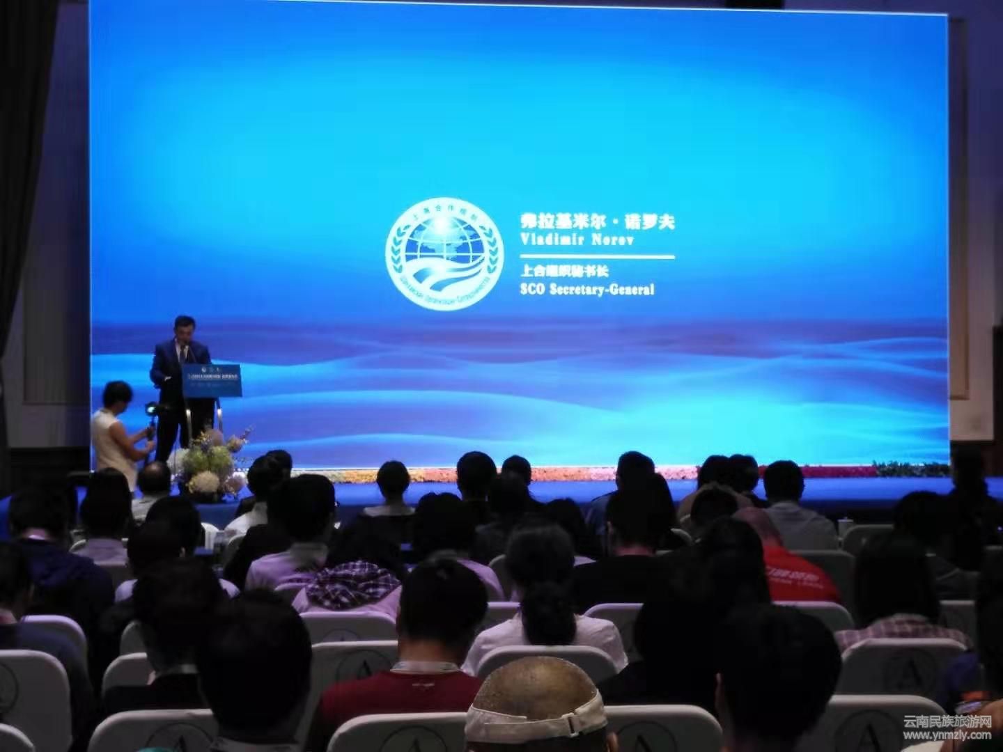 發(fā)布會(huì)上,上合組織秘書長(zhǎng)弗拉基米爾·諾羅夫向昆明市副市長(zhǎng)胡寶國(guó)授旗。