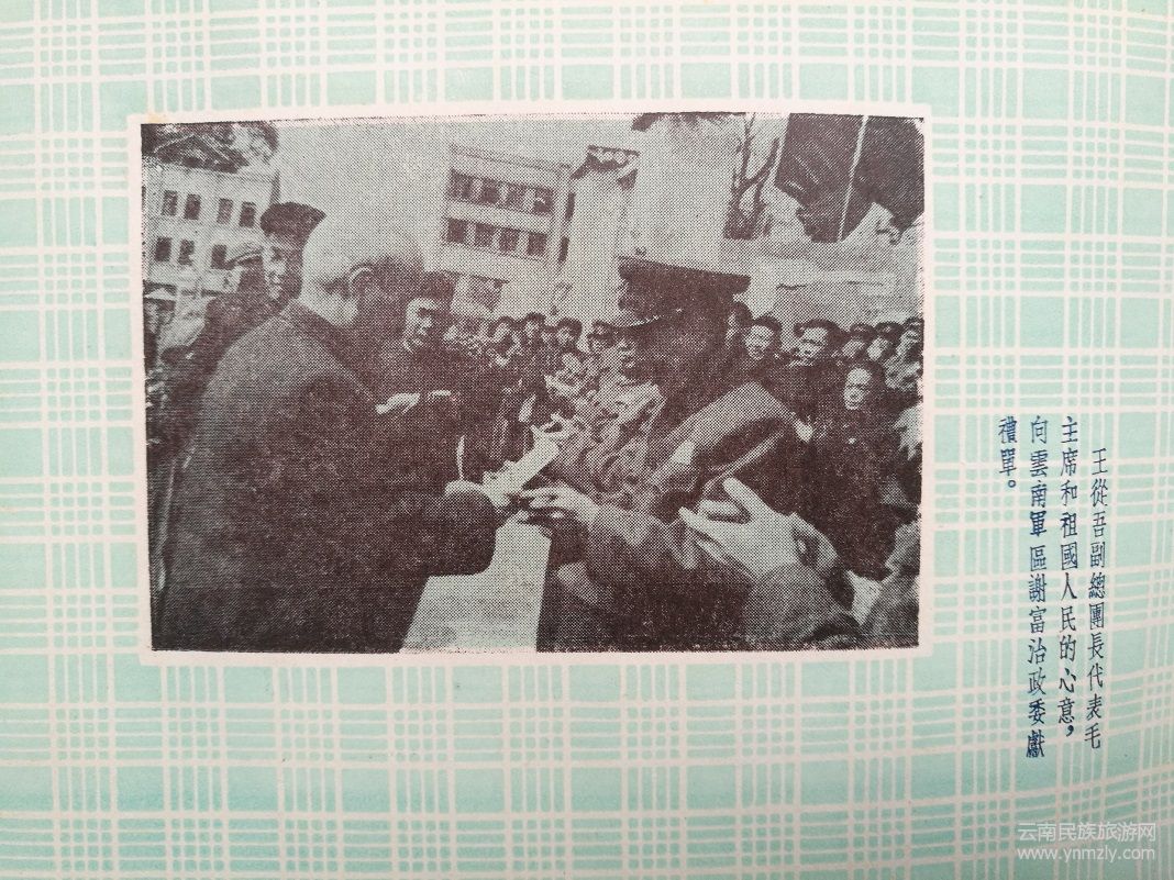 王從吾副總團(tuán)長(zhǎng)、蔡樹(shù)藩副總團(tuán)長(zhǎng)、志愿軍代表團(tuán)王永年副總團(tuán)長(zhǎng)等由軍區(qū)首長(zhǎng)陪同,從金碧路向近日樓歡迎臺(tái)行進(jìn):來(lái)自朝鮮前線的志愿軍文工隊(duì)隊(duì)員同志,受到了熱烈歡迎;王從吾副總團(tuán)長(zhǎng)代表全國(guó)人民慰問(wèn)解放軍代表團(tuán)向云南軍區(qū)廣大指戰(zhàn)員傳達(dá)了黨中央、中央人民政府、毛主席和全國(guó)人民的親切關(guān)懷和問(wèn)候;志愿軍代表團(tuán)王永年副總團(tuán)長(zhǎng)講話;志愿軍文工隊(duì)演出‘’歡迎舞‘’;慰問(wèn)團(tuán)各劇團(tuán)的全體同志,不顧疲勞,連日給駐昆部隊(duì)進(jìn)行慰問(wèn)演出,表演他們最優(yōu)秀的節(jié)目;慰問(wèn)團(tuán)來(lái)到有著20多年光榮斗爭(zhēng)經(jīng)驗(yàn)的‘’紅軍團(tuán)‘’,王從吾副總團(tuán)長(zhǎng)談到毛主席時(shí)刻惦念著邊疆戰(zhàn)士們的時(shí)候,‘’紅軍團(tuán)‘’團(tuán)長(zhǎng)、戰(zhàn)斗英雄顧永武的臉上露出了感動(dòng)的興奮的笑容:慰問(wèn)團(tuán)深入高寒山區(qū)慰問(wèn)堅(jiān)守一線的戰(zhàn)士等等。