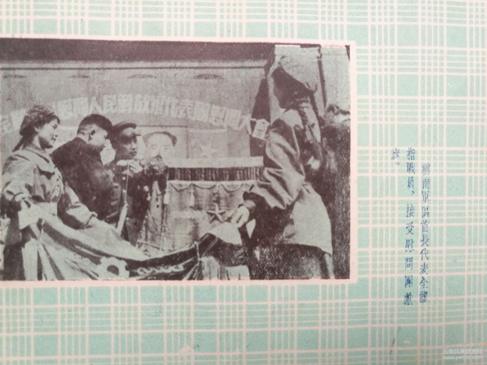 紀(jì)念冊(cè)還收集有云南軍區(qū)秦基偉副司令員在歡迎儀式上的致詞。他致詞表示,你們(代表團(tuán)全體同志)不遠(yuǎn)千里不辭勞苦的來(lái)到祖國(guó)西南邊疆,向云南軍區(qū)部隊(duì)進(jìn)行慰問(wèn),你們不僅帶來(lái)了中國(guó)共產(chǎn)黨中央、中央人民政府、毛主席和全國(guó)人民對(duì)我們的親切關(guān)懷,也帶來(lái)了毛主席關(guān)于黨在過(guò)渡時(shí)期的總路線的指示,帶來(lái)了4年來(lái)祖國(guó)經(jīng)濟(jì)建設(shè)的偉大成就。帶來(lái)了我們親密的戰(zhàn)友一一光榮的中國(guó)人民志愿軍在反侵略戰(zhàn)爭(zhēng)中的偉大勝利和寶貴經(jīng)驗(yàn)。云南軍區(qū)部隊(duì)4年來(lái)和全國(guó)各兄弟軍區(qū)部隊(duì)一樣,由于正確地執(zhí)行了中國(guó)共產(chǎn)黨和毛主席的指示,由于得到了人民的熱愛(ài)和支持,使我們?cè)诒Pl(wèi)邊疆鞏固內(nèi)防的斗爭(zhēng)中有力的打擊了帝國(guó)主義和殘匪對(duì)我邊境的寢擾,把守住了祖國(guó)西南的大門。