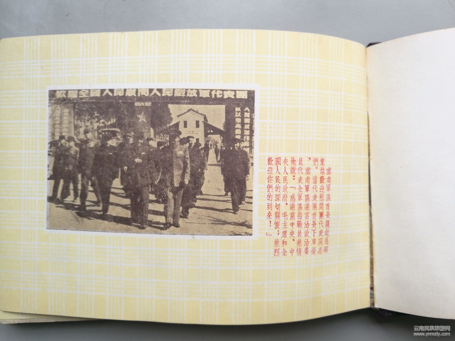 我收藏的這本《紀(jì)念冊(cè)》,是云南軍區(qū)為全國(guó)人民慰問(wèn)人民解放軍代表團(tuán)西南總分團(tuán)的慰問(wèn)活動(dòng)制作的紀(jì)念冊(cè)。紫絨布面,彩色卡紙,印刷精美。冊(cè)內(nèi)收集了幾十幅全國(guó)人民慰問(wèn)解放軍代表團(tuán)在云南的慰問(wèn)活動(dòng)的工作照片,是云南歷史文化的珍貴史料。圖片包括云南軍區(qū)政委謝富治赴昆明站歡迎代表團(tuán)代表同志;
