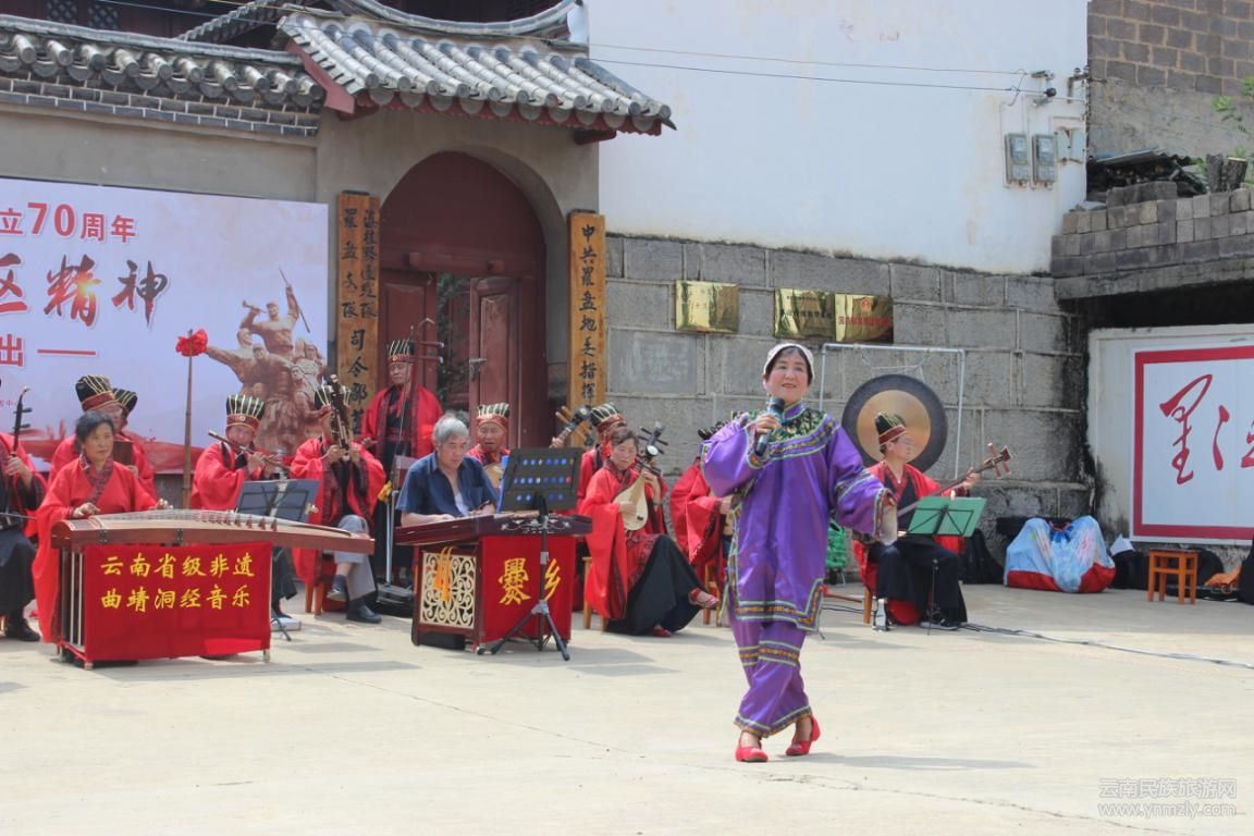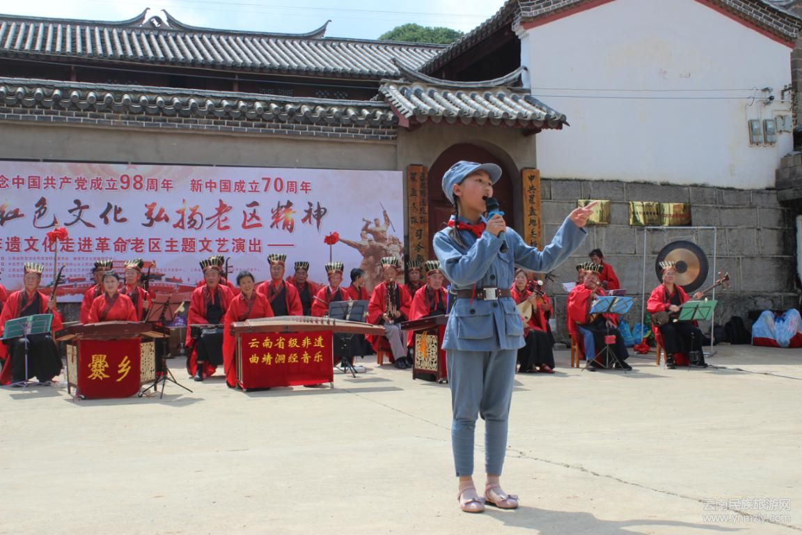 演出活動在開場舞《萬泉河水》的優(yōu)美旋律中拉開帷幕,緊接著,由曲靖市洞經(jīng)音樂協(xié)會演奏團演奏的省級非遺洞經(jīng)音樂展演《山坡羊》、《水龍吟》、《香供養(yǎng)》、《將軍令》此起彼伏,扣人心弦;由羅平縣鐘山鄉(xiāng)小紅軍藝術隊帶來的舞蹈表演《紅軍頌》、《紅星閃閃》把現(xiàn)場觀眾帶到了激情燃燒的革命年代。