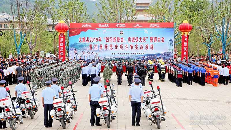 大姚縣委書(shū)記陸積峰宣布大姚縣2019年“踐行新使命、忠誠(chéng)保大慶”誓師大會(huì)暨掃黑除惡專(zhuān)項(xiàng)斗爭(zhēng)實(shí)戰(zhàn)演練開(kāi)始。陸積峰和縣委政法委書(shū)記余忠誠(chéng)共同打響發(fā)令槍?zhuān)菥毣顒?dòng)有條不紊的在廣場(chǎng)拉開(kāi)序幕。
