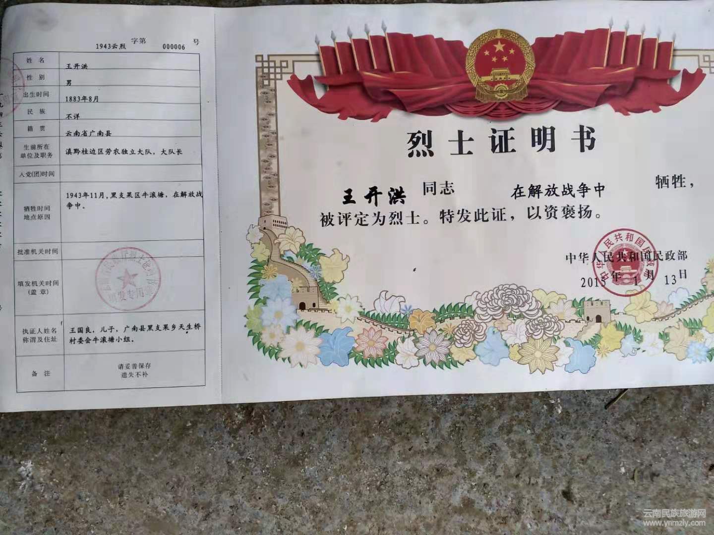 為追思王開洪,告慰英烈。1987年8月,云南省人民政府追認(rèn)王開洪、王咪章為革命烈士,其事跡被載入《云南人民英雄大典》;1988年,中華人民共和國(guó)民政部追認(rèn)王開洪為革命烈士,其事跡被載入《中華人民共和國(guó)人民英雄大典》。1999年廣南被云南省人民政府確認(rèn)為云南省土地革命時(shí)期的五個(gè)革命老區(qū)縣之一。2019年3月,廣南、富寧、麻栗坡縣被中央確定為“全國(guó)首批革命文物保護(hù)利用片區(qū)建設(shè)”。