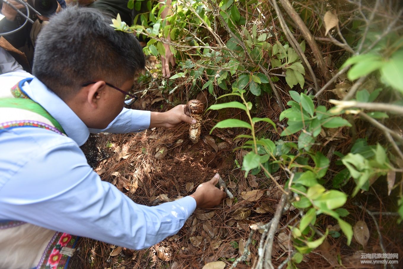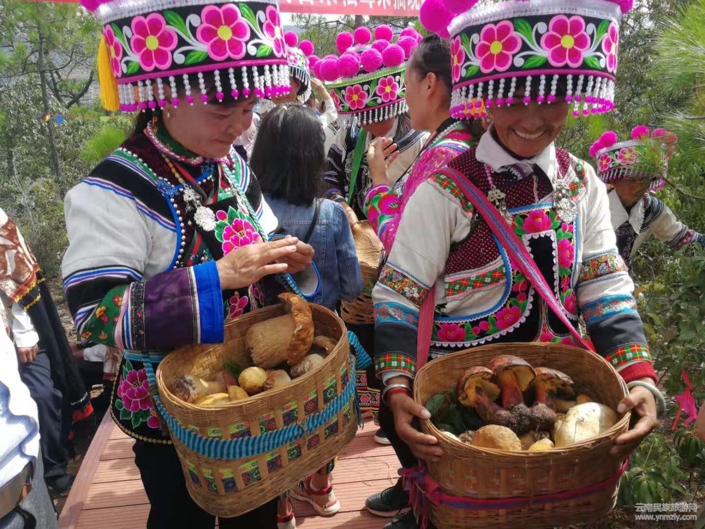 這一天,正好是雨后天晴野生菌大量出現(xiàn)的好日子,一大早,十里八鄉(xiāng)的鄉(xiāng)親們聞訊而來,開展祭獻(xiàn)領(lǐng)生、祭獻(xiàn)回熟、首朵松茸采摘、野生菌采摘體驗(yàn)和采摘成果展示、首朵松茸拍賣、原生態(tài)彝族歌舞展演等系列活動。畢摩誦經(jīng)祈求菌子豐收,菌農(nóng)們歡快打跳,唱迎賓調(diào)、彈四弦琴、吹迎賓大喇叭等傳統(tǒng)彝族民俗精彩紛呈,到處洋溢著豐收的喜悅。上午10時30分,菌農(nóng)們在畢摩的帶領(lǐng)下進(jìn)入百菌園,經(jīng)過一番尋找,“藏身”于草木叢中的第一朵松茸映入眼簾,畢摩為其系上紅繩后,由彝族少男少女共同摘下開山之后的首朵松茸。