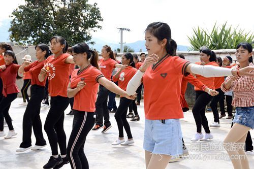 音樂響起,站立整齊、統(tǒng)一著裝的女子們隨著音樂起舞……漢莊鎮(zhèn)金竹田村委會(huì)舊寨二組的文化大院里,半邊天們翩翩起舞,絲毫不亞于正規(guī)的演出團(tuán)隊(duì)。舒緩的音樂、曼妙的舞姿,吸引了很多老人孩子涌來大院圍觀。