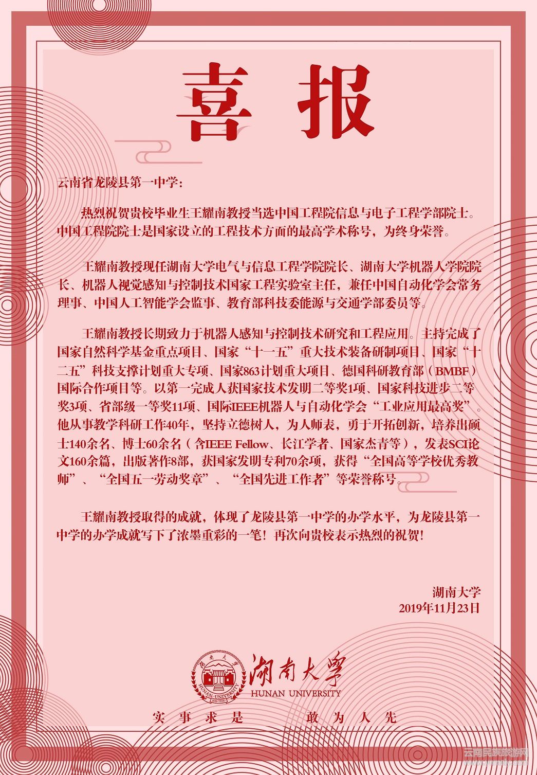 喜報(bào)說(shuō):“中國(guó)工程院院士是國(guó)家設(shè)立的工程技術(shù)方面的最高學(xué)術(shù)稱(chēng)號(hào),為終身榮譽(yù)。王耀南教授取得的成就,體現(xiàn)了龍陵縣第一中學(xué)的辦學(xué)水平,為龍陵縣第一中學(xué)的辦學(xué)成就寫(xiě)下了濃墨重彩的一筆,再次向貴校表示熱烈的祝賀!”