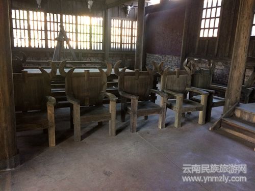屋里的所有梁柱和桌椅都沒有上漆,保持著本質的木色。歷經歲月的滄桑,古樸之中愈發(fā)顯得厚重。沉重的桌子后面,是寬大的類似歷代帝王的榻狀的坐具,坐具上的兩張虎皮雖然是仿制的,但也顯示著當年的佤王位置之尊。