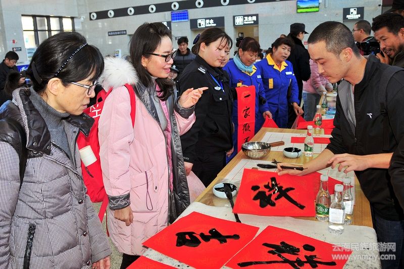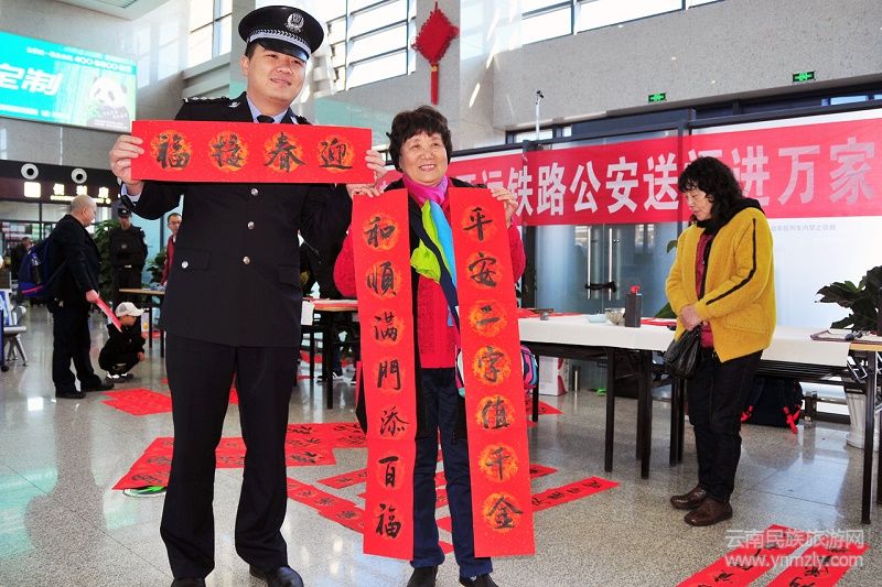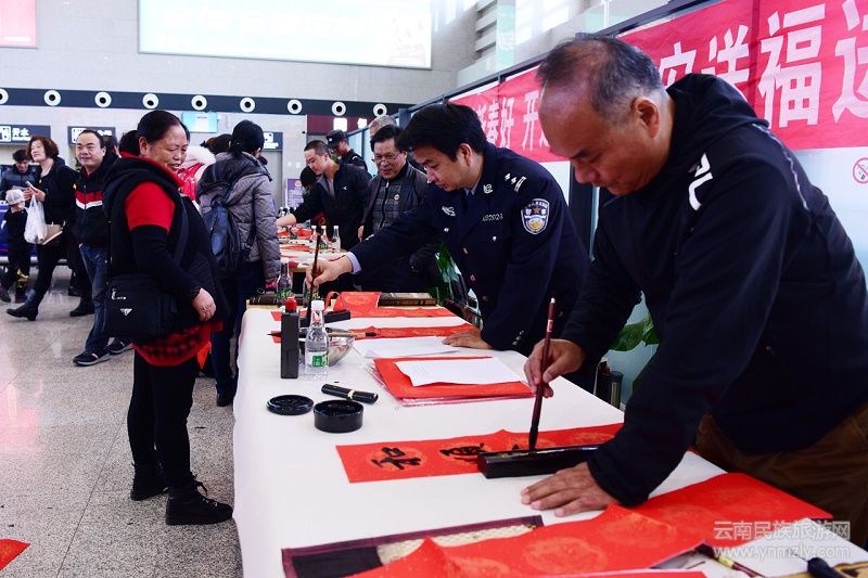 1月10日,昆明鐵路公安局開遠(yuǎn)公安處在轄區(qū)內(nèi)彌勒高鐵站開展紅火喜慶的“祖國新春好 送福進(jìn)萬家”活動(dòng),鐵路民警們與受邀的開遠(yuǎn)和彌勒兩市文聯(lián)協(xié)會(huì)的4位書法家現(xiàn)場揮毫潑墨,為歸途旅客送上新春祝福。
