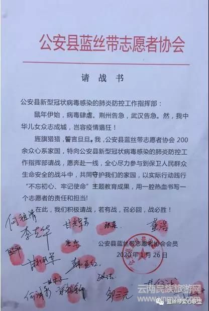 云南民族旅游網(wǎng)訊:2020年1月,新型冠狀病毒引發(fā)的肺炎疫情開(kāi)始蔓延。危難之際,公安縣“藍(lán)絲帶”志愿者協(xié)會(huì)會(huì)長(zhǎng)、支部副書(shū)記甘輝芳來(lái)到縣疫情防控指揮部,遞上會(huì)員們簽字按著紅指印的請(qǐng)戰(zhàn)書(shū),用一腔熱血書(shū)寫(xiě)了他們的責(zé)任和擔(dān)當(dāng)。短時(shí)間內(nèi),在黨員的帶領(lǐng)下,廣大會(huì)員紛紛行動(dòng)起來(lái),奔赴疫情一線(xiàn)陣地。