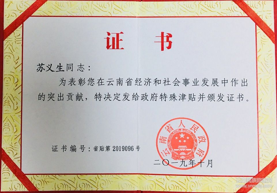 由于在脫貧攻堅和理論宣講方面作出的貢獻,蘇義生被評為2019年度“云南省享受省政府特殊津貼”專家、2019年度中宣部“基層理論宣講先進個人”。