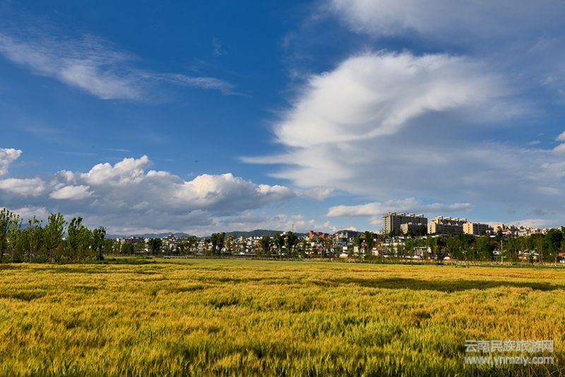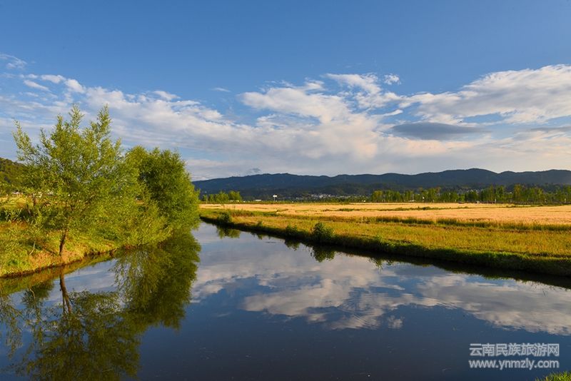 說(shuō)右甸壩被金黃色“淹沒(méi)”,其實(shí)也不準(zhǔn)確,因?yàn)橛幸粭l“線”,就沒(méi)有被“淹”。這就是在壩中蜿蜒穿行的右甸河。天堂山潺潺而來(lái)的右甸河如同葉的主脈居壩中,十余條大大小小的溪流如支脈連著四面環(huán)山,串成山壩之間、城鄉(xiāng)之間的聯(lián)絡(luò)線。已知的人居歷史表明,就是這潺潺之水,吸引了先民在此生活,興起了徐霞客“來(lái)往稠人中”的小城,滋潤(rùn)出了楊升庵“遠(yuǎn)夢(mèng)似曾經(jīng)此地,游子恍疑是故鄉(xiāng)”的鄉(xiāng)愁家園 。