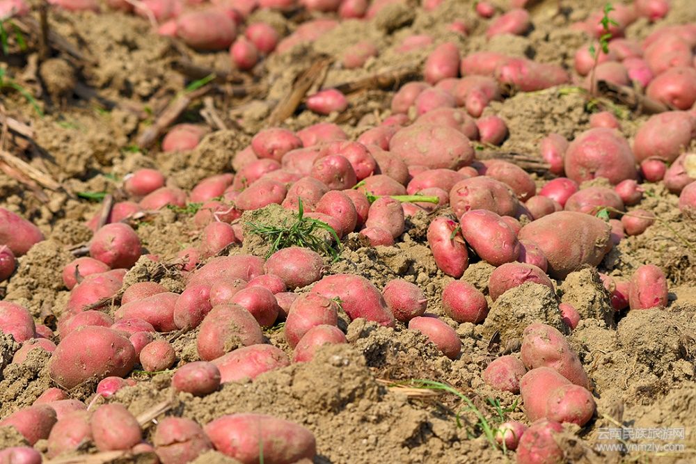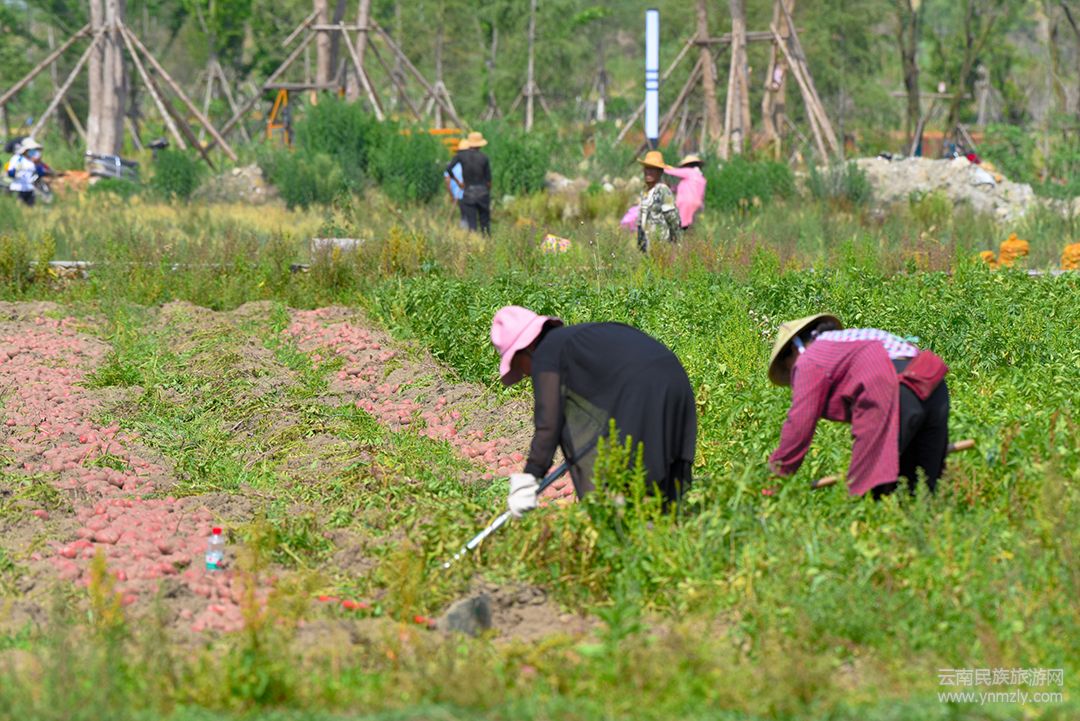 這段時間的右甸壩,挖洋芋同樣是主要的農(nóng)事,農(nóng)民們先是把還綠的洋芋樹扯到半邊,然后熟練地用鋤頭挖開,然后將一個個洋芋撿出來,用精準的手法扔進堆里。隨著鋤頭飛舞,一個個成熟的紅皮洋芋從泥土里鉆出來后,以一條條優(yōu)美的弧線,在人們的臉上飛出一個個燦爛的笑臉。