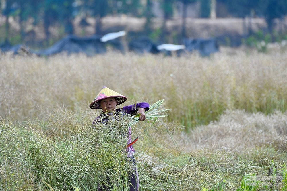 在右甸壩的農(nóng)田里,隨處一看便能看到許多揉菜籽的人,主要以中老年女性為主。她們有的在小心地將結(jié)滿莢的沒菜割下,堆在田間;有的拿著一根小棍子,輕輕地敲打脫粒;有的用手輕輕地抖動著敲打過的莢和稈,讓菜籽全部抖落在事先墊好的塑料布上面。每一個動作都那么認真、那么輕柔,仿佛擔心一不小心就驚醒了沉睡的菜籽一般。