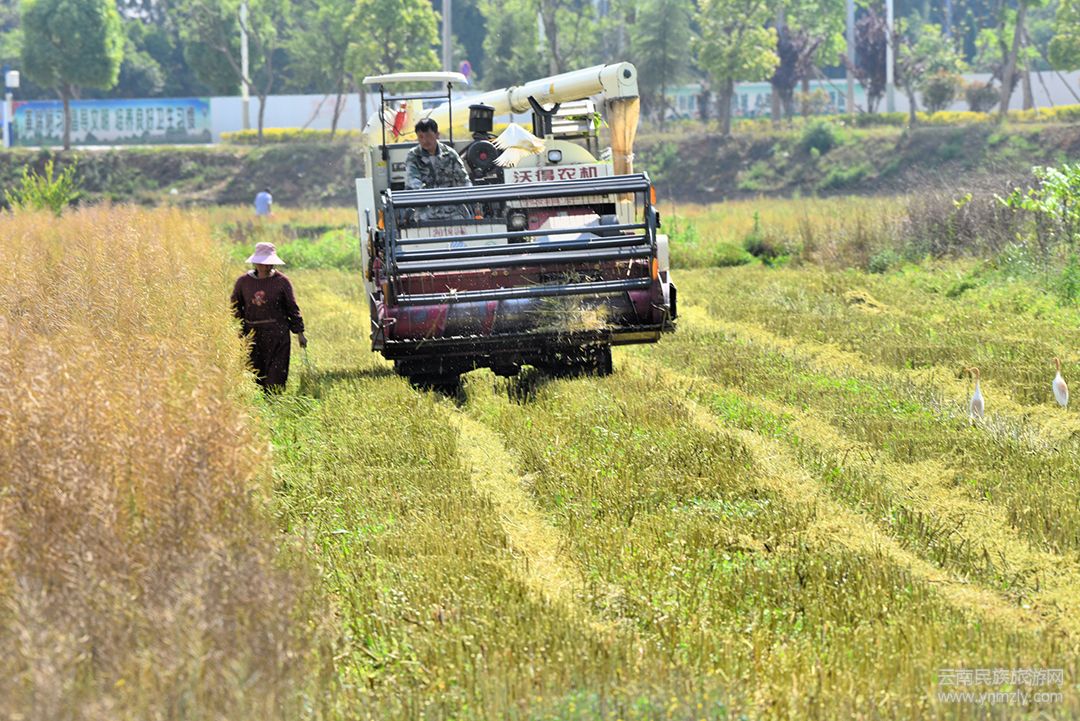 當然,也不是所有的人都那么小心,有的人也開始使用現(xiàn)代化“武器”來收割菜籽。在田園的另一邊,一臺聯(lián)合收割機正在轟鳴著,一丘大約一畝左右的菜籽田,幾分鐘后就只有一些碎好了的殼和稈留在田間。幾只換上了“盛裝”的牛背鷺應聲而來,在田間享受屬于自己的收獲。