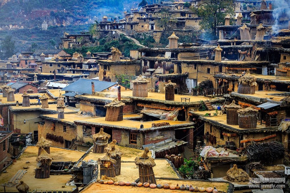 “相傳,古村中一位叫阿嗄的彝家小伙,為改變村民住洞穴、棲樹枝的原始居住方法,在飛鳳坡頂,冥思苦想了三天三夜后,到山中砍來六百六十六棵栗樹,挑來九百九十九挑粘土。用土筑墻,墻上橫搭木料,密鋪木棍、茅草,再鋪一層土;土皮頭灑水,然后用石頭一層層夯結(jié)實。就這樣,一幢幢左右連接、上下相通的土庫房,就在飛凰山坡被建造出來……”