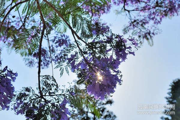 “紅藍鉛”的另一頭,是沉穩(wěn)的藍。藍花楹的樹婆娑高雅,晶瑩的紫藍色精靈,一簇挨著一簇、一團連著一團,在風中舞動著曼妙的身姿,在陽光下盡情微笑。淺淺的藍、淺淺的紫、淺淺的綠,交織出讓人陶醉織錦,溫柔地拂去喧囂、躁動、不安,將太陽的光變成千萬條絲帶,輕盈地落在地上。