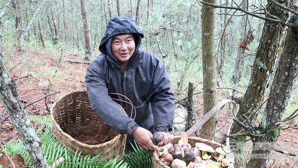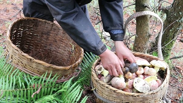 蔣開洪從早上我6點(diǎn)到9點(diǎn),翻山越嶺,走遍了自己熟知的5個(gè)菌塘。采摘到了滿滿一籮筐新鮮的野生菌。他會(huì)把他們交售到當(dāng)?shù)匾患倚∮忻麣獾囊吧r(nóng)家樂,賺取自己一天的收入。