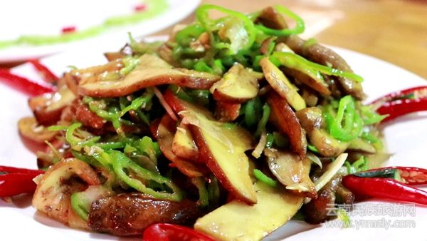 粉菌,作為野生菌的“主力軍”,在姚關(guān)久遠(yuǎn)的飲食文化中演化出了多種做法,而今天海艷給我們做的就是一種最大眾的做法——粉菌炒辣椒。只見她將早上新摘的粉菌洗好后切片,將油燒熱,當(dāng)油溫合適后放入粉菌,炒熟后備用。再放入姜絲、蔥片、辣椒絲、花椒,當(dāng)聞到佐料香味后放入備用的粉菌,將粉菌的清香與佐料的鮮香充分結(jié)合。一道美味的粉菌炒辣椒就新鮮出鍋了。