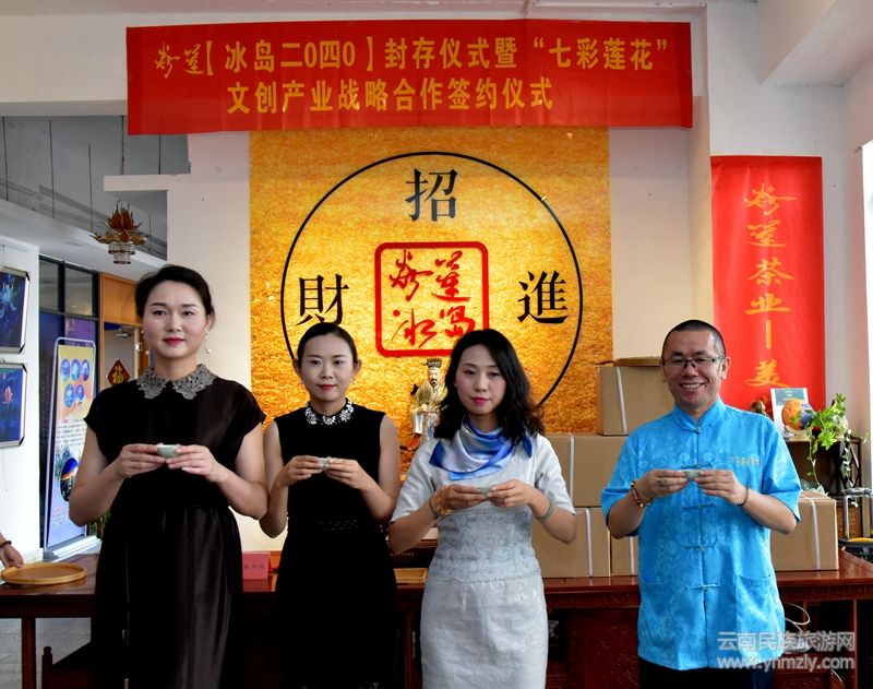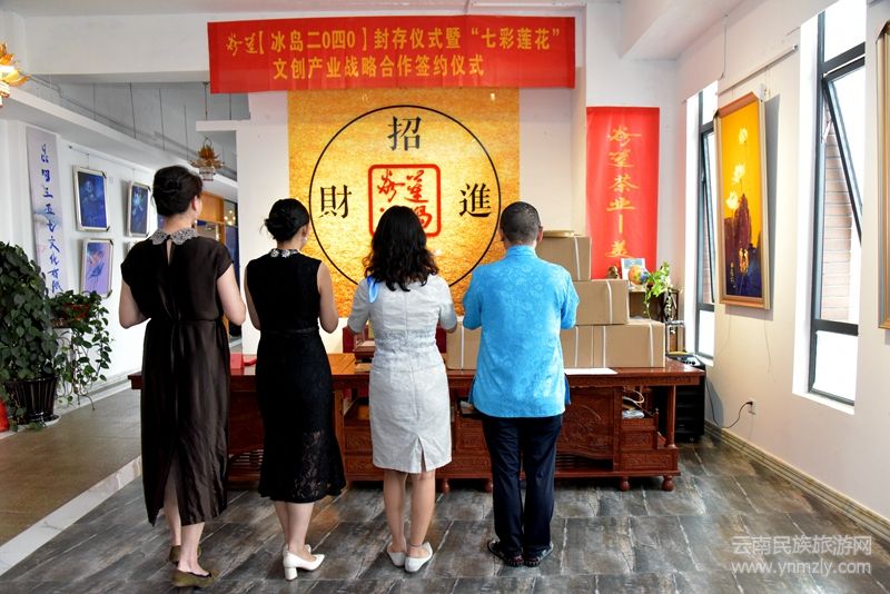 云南民族旅游網(wǎng)訊(文圖尹紹平 李關(guān)富)以丁昌勝先生七彩蓮花畫(huà)作為元素,結(jié)合冰島古樹(shù)普洱茶相互疊加的焱蓮【冰島二0四0茶磚】收藏封存儀式于一個(gè)吉祥的日子一2020年8月8日在紫云青鳥(niǎo)丁昌勝美術(shù)館圓滿舉辦。丁昌勝美術(shù)館與四川成都的桐鳳文創(chuàng)“七彩蓮花”文創(chuàng)產(chǎn)業(yè)戰(zhàn)略合作簽約儀式也同時(shí)成功舉行。