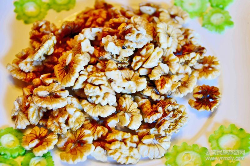 核桃的吃法也很豐富。核桃仁醮蜂蜜、核桃鹽、核桃燉雞、涼拌核桃仁、油炸核桃仁、素炒核桃仁以及將核桃與各種肉類、蔬菜一起做出來的各種菜,色香味俱全,充滿了誘惑。