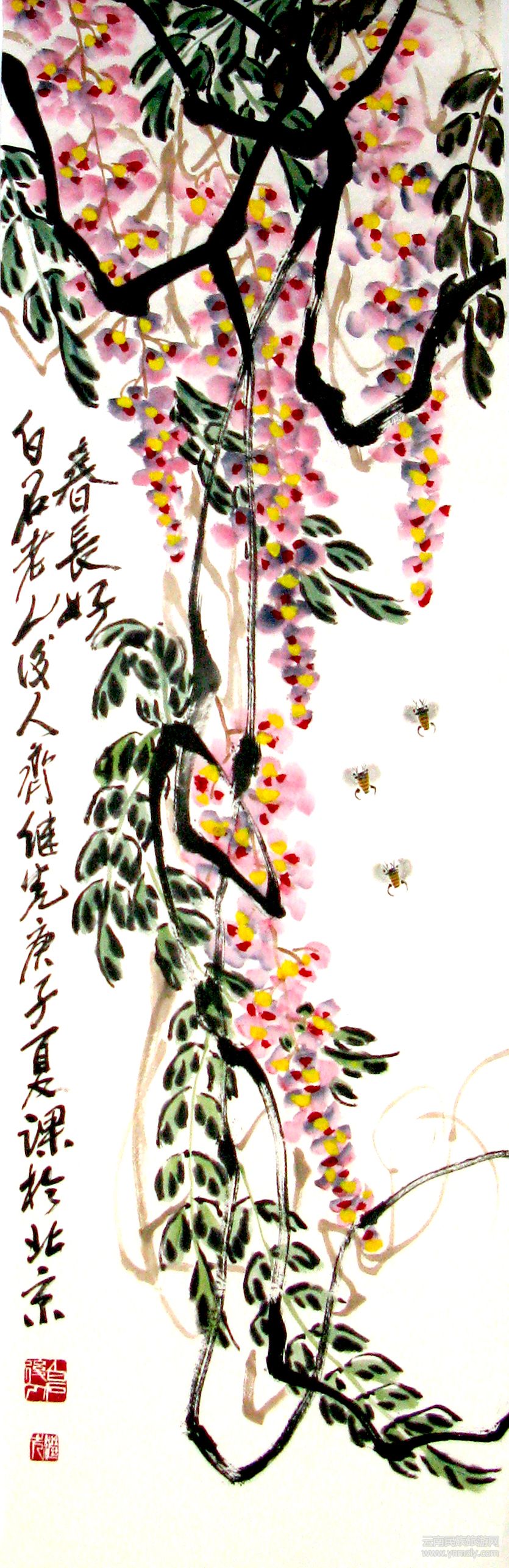 應(yīng)該說,詩性,也是天山先生畫的一大集成。如《萬紫千紅總是春》,畫上一串紫藤瑞氣盈盈、燦若云霞由左上角穿插而過,其間六只可愛的小蜜蜂在嗡嗡地鬧春。作者題詩言:“墨走垂藤百尺長,濃陰合處日無光;筆中自有東風(fēng)在,吹得紫藤紙上香。”文字恬淡自然樸實,“不粘不脫”深化了畫意。還有他的題畫桃:“開花結(jié)果三千年,瑤池王母侍群仙;揮毫摘得蟠桃在,人人得此是神仙。”題畫牽?;ǎ?ldquo;野根不用栽,只等秋時來;無聲喇叭艷,朝朝花自開。”題畫山水:“墨出千層色,筆劈萬仞山。”題畫蟹:“殼硬雙螯好威嚴(yán),八爪橫行奪利貪;它日鉆進(jìn)漁翁簍,方知己肥命將亡。”均給人一種清純、高雅之氣,也顯示出作者的恬淡清凈品格。