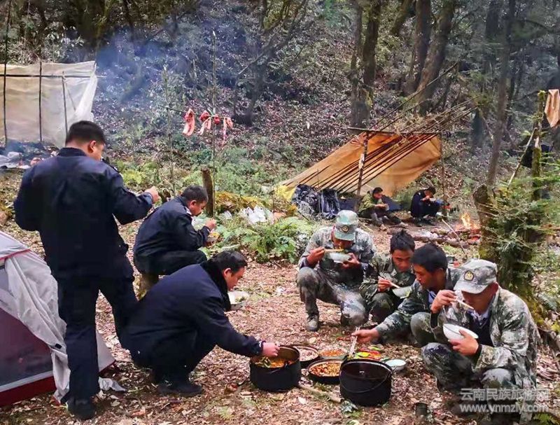 陡峭的山坡,茂密的樹林,崎嶇的山路,蜿蜒的小溪,滿是冰晶的林間草地,成為巡護之路的全部。傍晚時分,巡護隊已入高黎貢山深處。龍大河畔,一塊平地成為了巡護隊臨時營地。炊煙裊裊半個多小時,一頓“大餐”撲鼻而來。席地而坐,鳥鳴耳畔,山風拂面。一碗米飯、三菜一湯,一天的疲勞一掃而光。