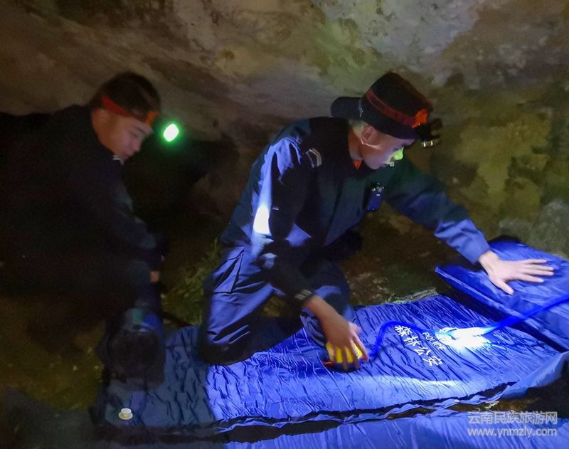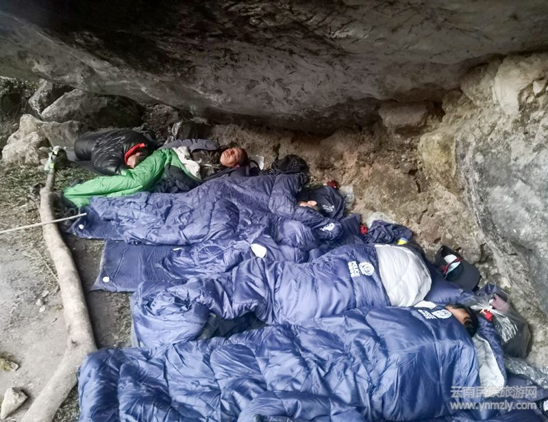 崖壁腳的山洞,宛如一個天然帳篷,給了隊員一個棲身之所。轉(zhuǎn)眼之間,夜幕降臨,隊員們相互幫忙展開睡袋。躺在“床”上,外面已伸手不見五指,聽著山風呼呼,隊員們在寒意中慢慢進入了夢鄉(xiāng)。