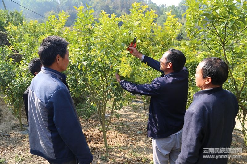 云南民族旅游網(wǎng)訊(通訊員李長明 楊治文)初春時節(jié),走進風光迷人的龍江畔,隨處散發(fā)著勃勃的生機。在龍陵縣龍山鎮(zhèn)橫山村沃野連片的砂糖桔種植基地,金黃的橘子笑盈盈的掛滿枝頭,公司負責人許國增正耐心細致的給工人介紹如何修剪果樹。