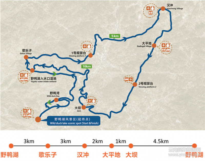 第十二屆北京國(guó)際山地徒步大會(huì)云南盤龍站賽線路由昆明市盤龍區(qū)國(guó)家登山健身步道1號(hào)線(野鴨湖環(huán)湖步道)、2號(hào)線(溪谷步道)、3號(hào)線(山岳步道)的部分路段集數(shù)條岔道組成,全程13.5KM,最低海拔2052M,最高海拔2189M,有林間落葉小路、傍山路、傍水路、鄉(xiāng)村路、泊油公路、木棧道、石板路、沙石路等多種路面,適合組織登山徒步、露營(yíng)、野外生存、山地自行車等經(jīng)典戶外運(yùn)動(dòng)。沿途自然風(fēng)光優(yōu)美,有野鴨湖環(huán)湖自然風(fēng)光、溪谷風(fēng)光,同時(shí)還可以體驗(yàn)沿途自然村落的風(fēng)土人情,是集自然風(fēng)光、人文景觀為一體的徒步線路。