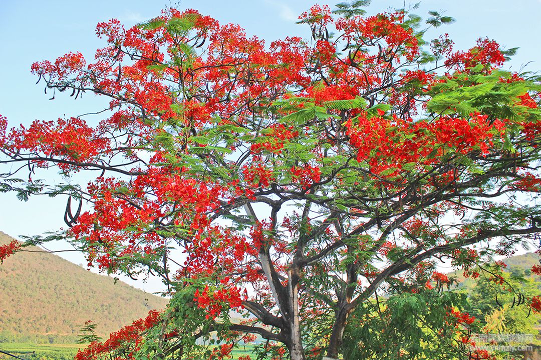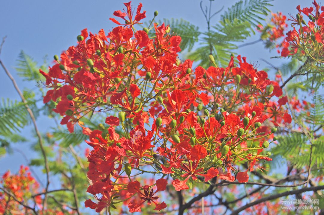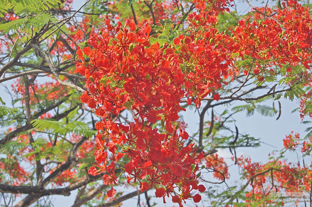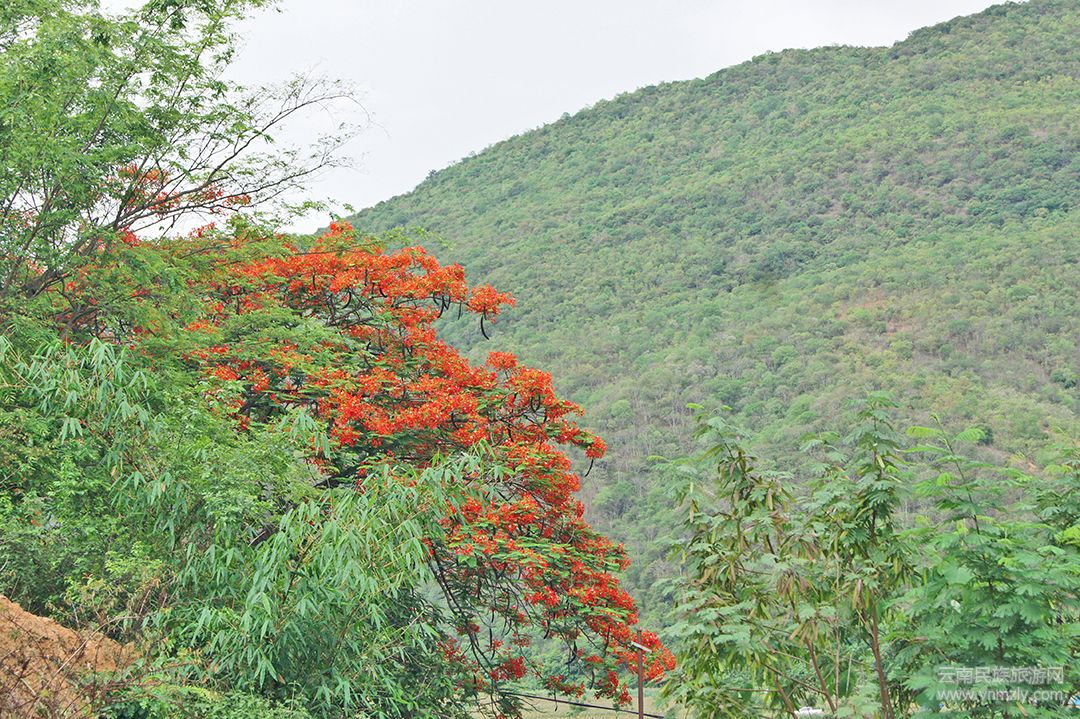 鳳凰花生命力極其旺盛,耐干旱耐高溫,正因如此,才足以在海拔1000米以下的灣甸壩繁衍生息。山坡上、公路旁、村中寨頭……到處都有它們的芳蹤。它們有的獨(dú)樹(shù)成景、有的三五棵成群、還有的十幾棵成林。