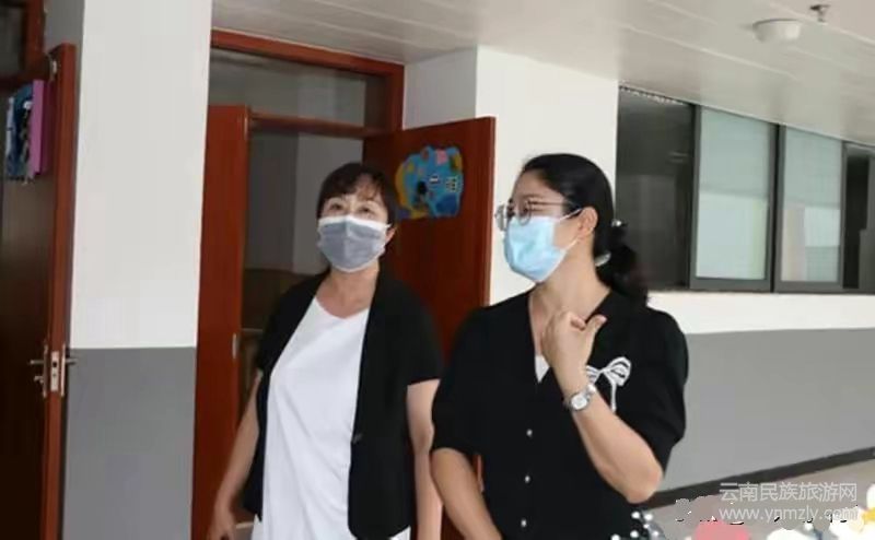 巧家縣副縣長卓永東(右)一行蒞臨金沙幼兒園檢查指導(dǎo)工作,尹嬌嬌總園長(左)陪同