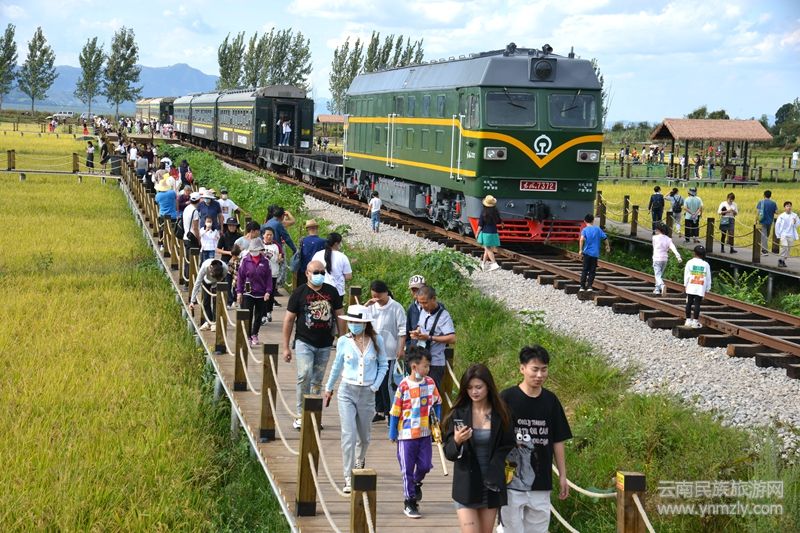 慕名前來的游客們沿著稻田邊的景觀棧道,一路感受田園風光、體驗農耕文化,與穿越稻田的網紅綠皮小火車拍照留影。