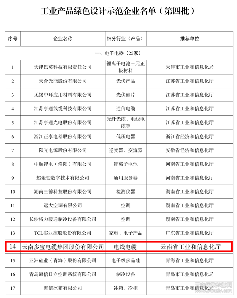 本網(wǎng)訊(尹紹平)近日,按照國(guó)家《“十四五”工業(yè)綠色發(fā)展規(guī)劃》和工業(yè)領(lǐng)域碳達(dá)峰實(shí)施方案要求,工業(yè)與信息化部公布了第四批工業(yè)產(chǎn)品綠色設(shè)計(jì)示范企業(yè)名單。云南多寶電纜集團(tuán)憑借在綠色產(chǎn)品設(shè)計(jì)、綠色創(chuàng)新開(kāi)發(fā)等方面的突出表現(xiàn),成為云南省唯一一家上榜企業(yè)。