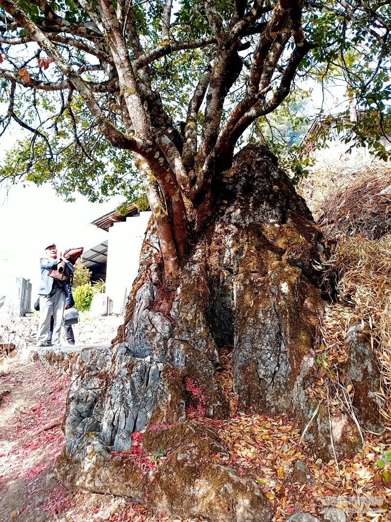 從林間石筍上行數(shù)十米,一株古杜鵑屹立在山門口石縫間,古老歲月將其半身軀干磨蝕,剩下半棵空心軀干仰面朝天,彎曲向南平伸,形成一個木槽。木槽生命力極強(qiáng),在其周圍環(huán)生出一叢繁茂枝葉的棚子。人入木槽,或坐或臥,如于草屋中休憩納涼,形成一間“木槽草屋”。