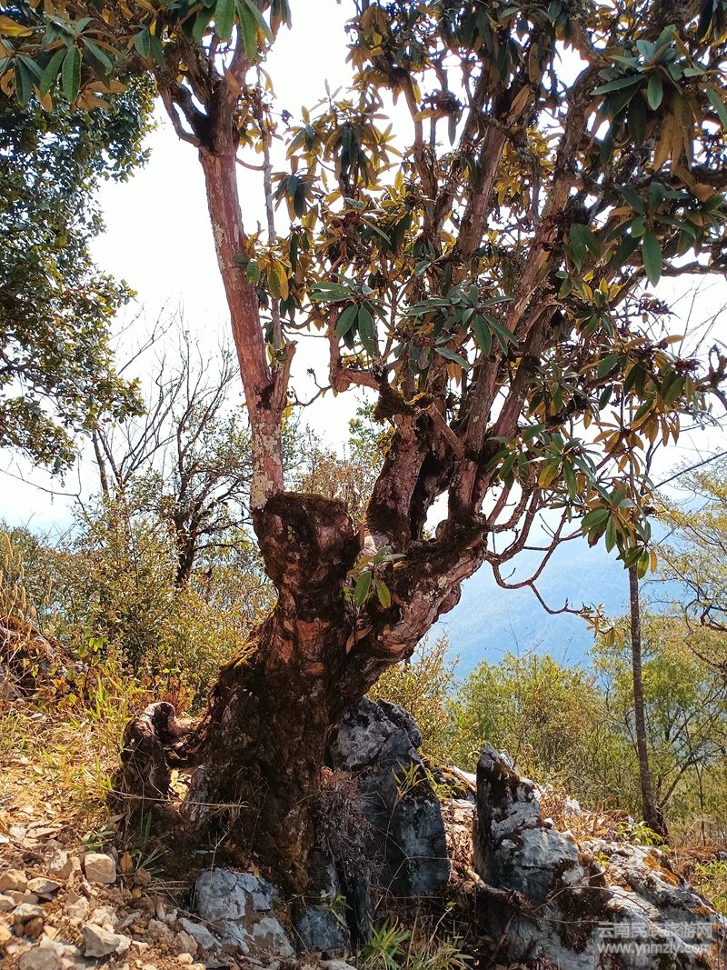 沿著天梯上行至半腰,道旁的一棵古老空心杜鵑,赫然在簇簇石蓮中間重獲勃勃生機(jī),繁盛枝葉伸而出,猶如迎候賓客的手臂,恰似黃山迎客松,名為“杜鵑迎客”。