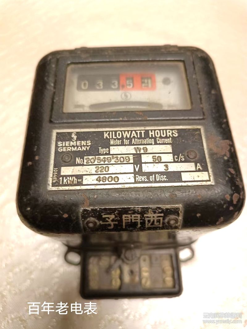 有一次,在南屏街的古玩城,我見到一塊外國電表,店主在電表旁邊標(biāo)注,說“這是一塊德國制造禪臣牌交流電度表,大清光緒年末由德國制造出口中國,昆明是全國較早使用交流電的地方,中國第一座水電站,石龍壩水電站,現(xiàn)已成為全國重點文物保護(hù)單位,該電表體積小,水晶玻璃窗框,至今運行正常,內(nèi)部結(jié)構(gòu),可靠性能等指標(biāo),超過目前中國制造的電表,(百年回顧)”,我見到后,當(dāng)即把它買了下來,這是我收藏的第一塊電表?,F(xiàn)在,在我收藏的十多塊電表中,既有國外的,也有國內(nèi)早期制造的。