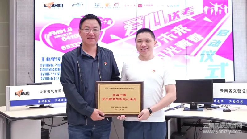 FM91.8云南交通之聲總監(jiān)施彥涵(左)為云南多寶電纜集團股份有限公司總裁鄭曉彬(右)授牌
