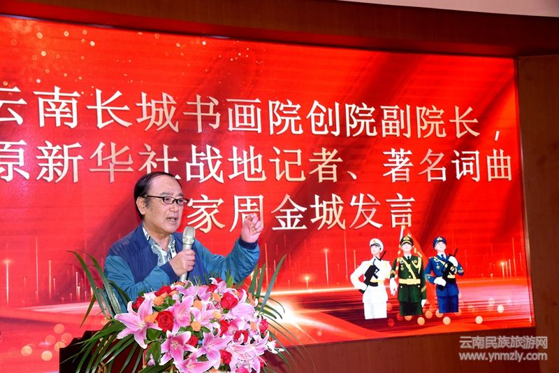 云南省軍區(qū)廣東籍老兵陳道泉,云南長(zhǎng)城書畫院創(chuàng)院副院長(zhǎng),新華社原戰(zhàn)地記者、著名詞曲作家周金城上臺(tái)發(fā)言,長(zhǎng)城書畫院八一老兵張德華敬獻(xiàn)字畫。