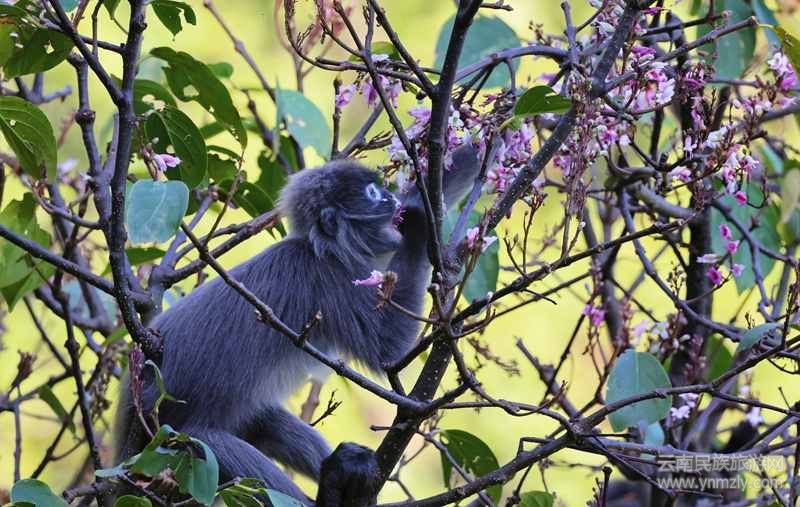 金秋十月,正值龍陵小黑山保護區(qū)美麗桐類、含笑類、木蘭類等植物開花的時節(jié),這些植物的花,在菲氏葉猴的“菜譜名單”里,也是它們喜歡吃的“美味佳肴”。視頻里,一群全身銀灰色、長著一雙圓溜溜“大萌眼”的菲氏葉猴,不約而同地集聚到幾棵美麗桐的樹冠上,不是攀附在枝頭就是蹲坐在樹干上,或不停地采食紫紅色的花朵,動作嫻熟而得心應(yīng)手,或邊咀嚼食物邊觀察周圍動靜,時不時揮動著手,做出各種呆萌可愛的小動作,盡情地享用著大自然賜予的饕(tāo)餮(tiè)美食……一頓飽餐后,進入休閑狀態(tài),時而相互梳理毛發(fā)撓癢癢,時而集體停歇在樹干上養(yǎng)神,畫面和諧而溫馨。