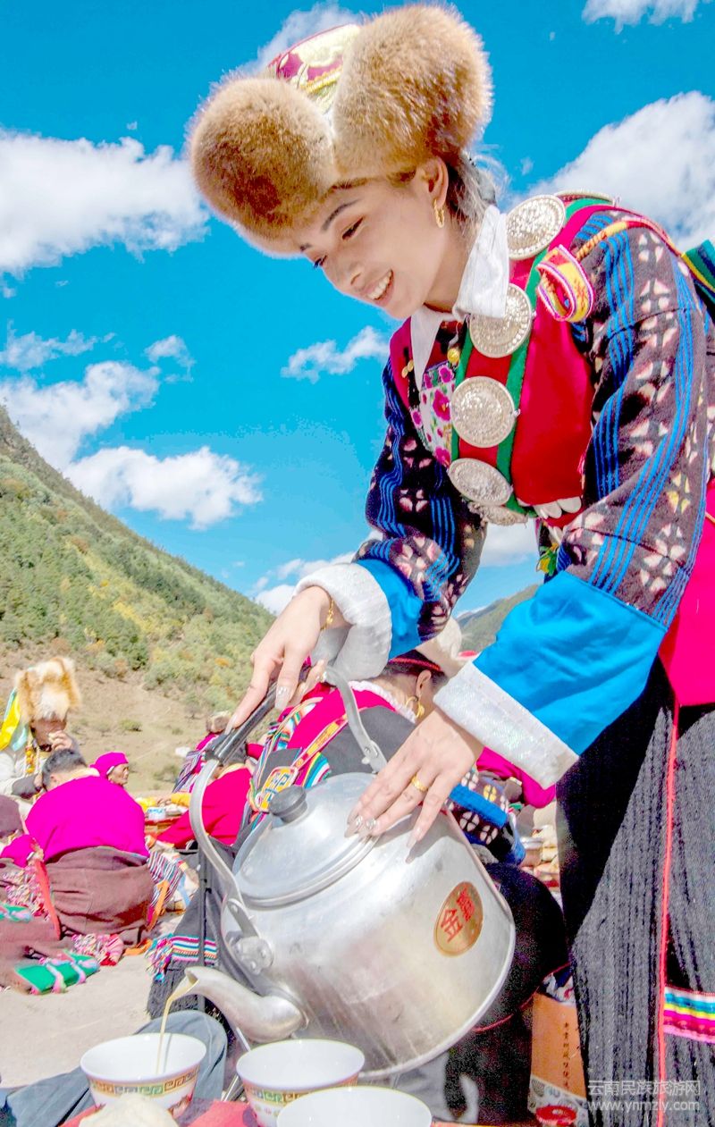 4、村里的姑娘送來酥油茶,人們圍坐在自家桌子前吃糕點,聊著吉祥如意的事。