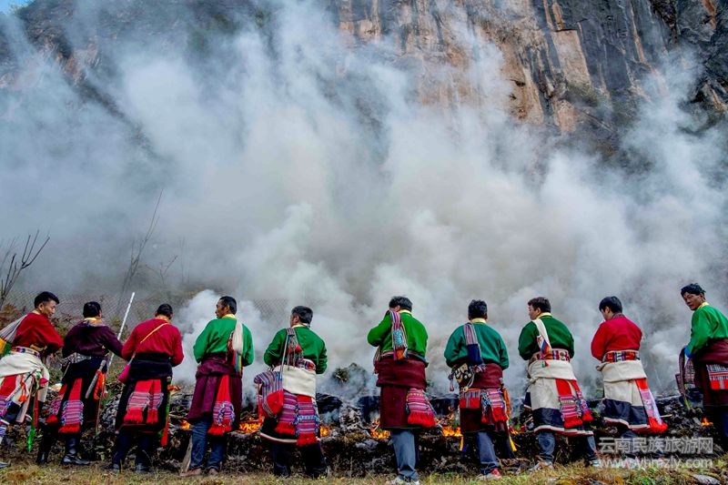 5、時辰一到,在倉巴主持下,半山腰一長排燒香臺升起了濃濃的祭山香煙,整座神山彌漫在濃郁的香樹葉煙霧中。