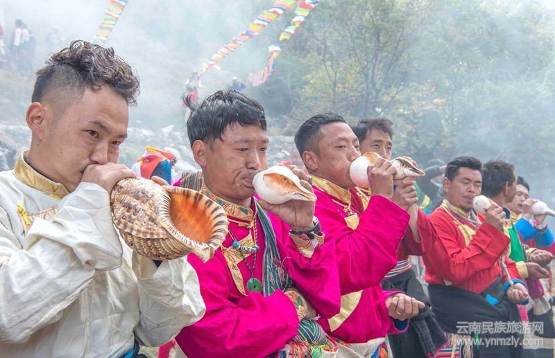 6、香煙彌漫中,人們吹響了法螺,震撼的法螺聲回響在四周的雪山之中。祭山活動開始進入到高潮,整座神山沉浸在一片神秘古老的祭祀氛圍中。