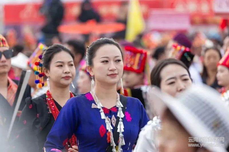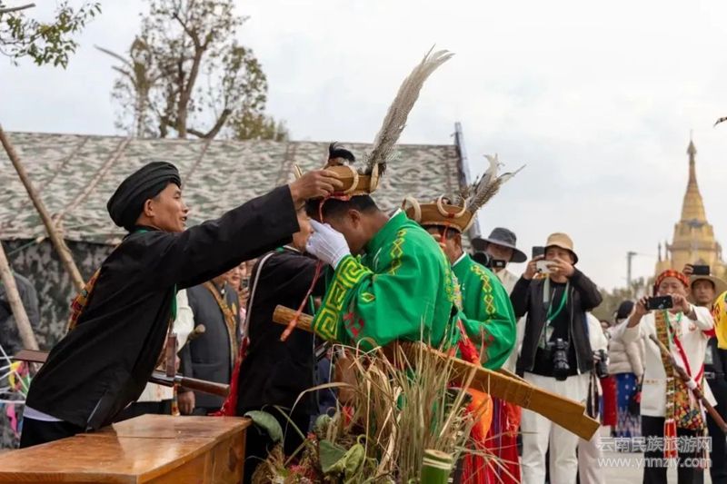 早上9點,舉行了隆重的授冠儀式,瑙雙、瑙巴帶領(lǐng)著數(shù)千名身著節(jié)日盛裝的各族同胞排成舞隊緩緩進場,氣氛逐步推向高潮。