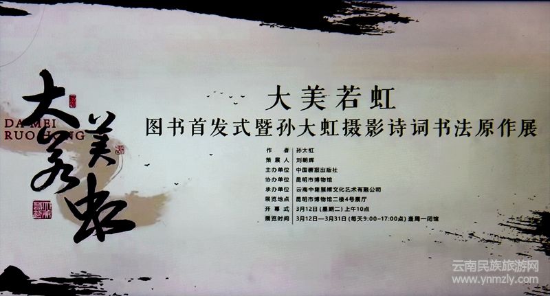 本網(wǎng)訊:3月12日上午10時(shí),中國(guó)畫(huà)報(bào)出版社《大美若虹》圖書(shū)首發(fā)式暨孫大虹攝影詩(shī)詞書(shū)法原作展將在昆明市博物館舉行。