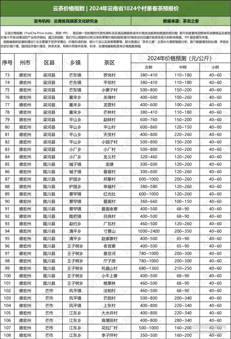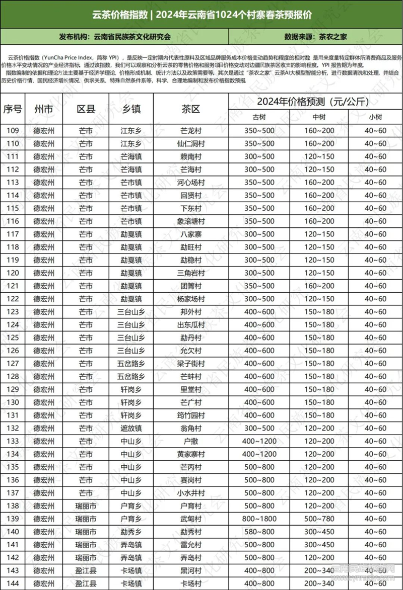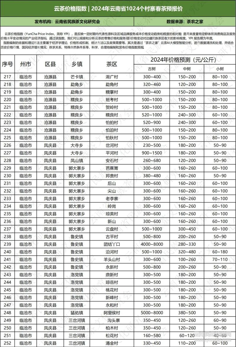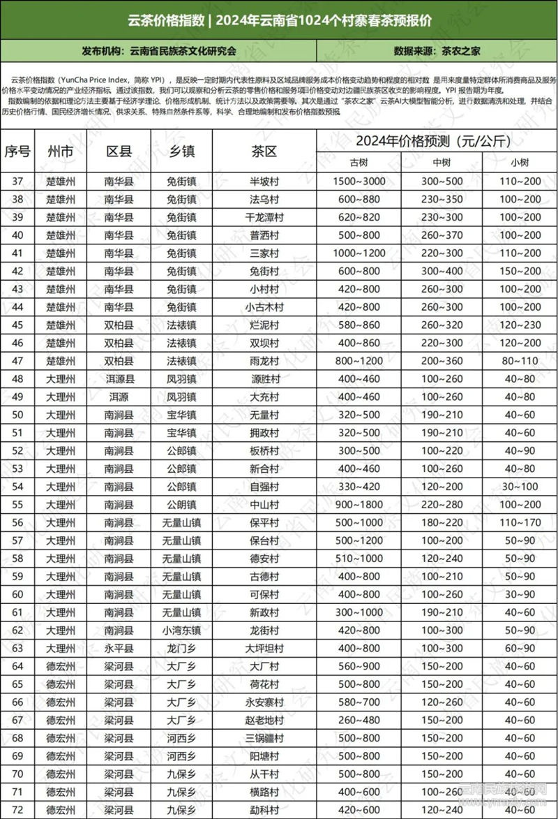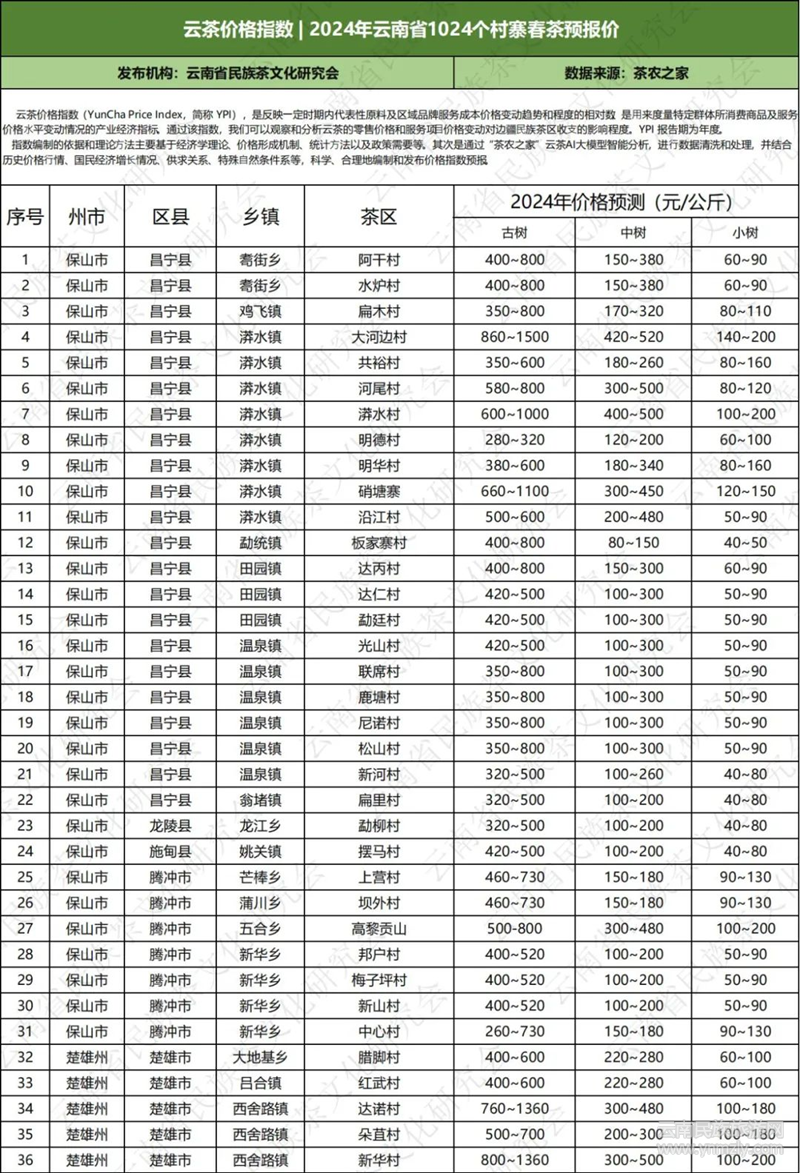 云茶價格指數(shù) | 2024年云南省1024個村寨春茶預(yù)報價
