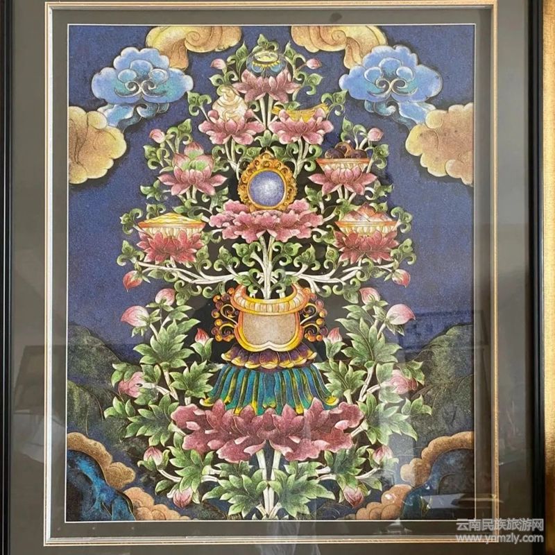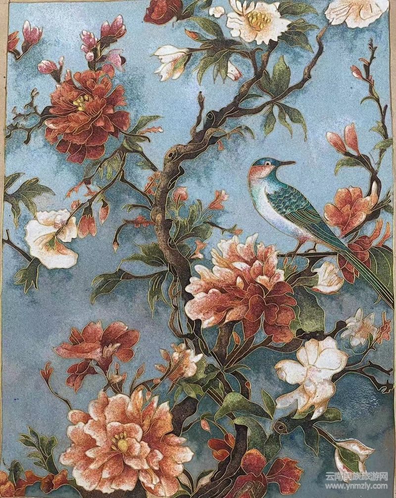 有資料介紹,掐絲琺瑯彩畫(huà)技藝起源于元朝 1253年,即忽必烈和麗江阿良聯(lián)合攻打大理國(guó)(普米族人充當(dāng)了先頭部隊(duì))時(shí),留下了部分琺瑯工匠及銀胎琺瑯器皿,并運(yùn)用了景泰藍(lán)的鑲聯(lián)工藝,用金屬銅絲、銀絲和彩沙石、礦粉為主要原料,精心制作出各種風(fēng)格、圖案、顏色、規(guī)格的裝飾畫(huà)。