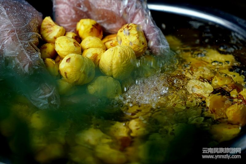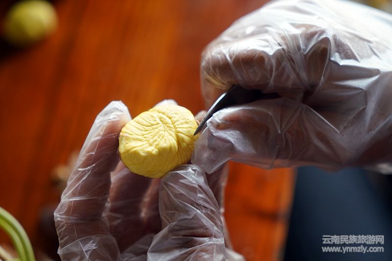 板栗的處理是一門“有粗有細(xì)”的手藝活,剝開棕色的“外套”,再用刀尖輕巧剝離褐色的“內(nèi)衫”,一顆金黃誘人的板栗便出現(xiàn)了。